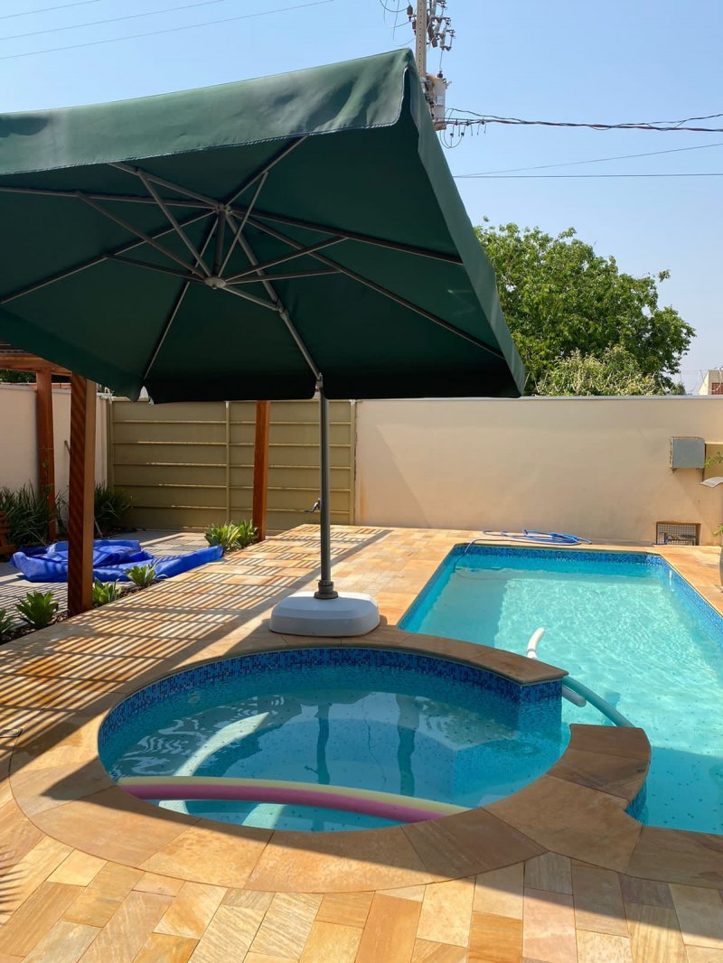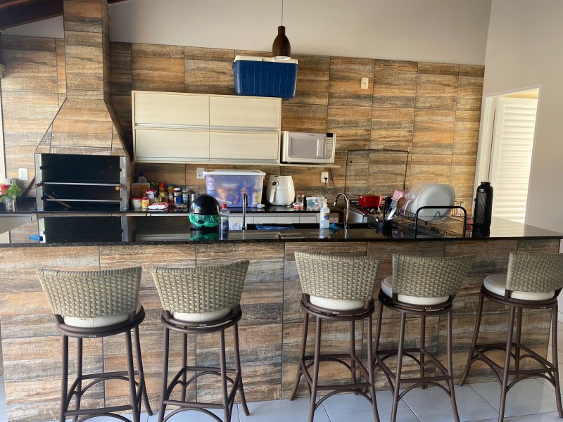 Casa com 3 Suítes com ar condicionados, sendo em uma delas com guarda-roupas embutido, banheiro social externo, cozinha gourmet em ilha com armário embutido, portas de vidros, ventiladores, todos banheiro com box de vidro, piscina aquecida com hidro e cascata, pergolado de madeira, jardim, cerca concertina eletrificada.
